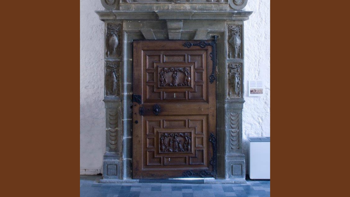 This framed door once provided access to the meeting room of the Fishmongers’ Guild in Brussels. When the baroque guild house on the banks of the Senne was demolished in 1872, the door was preserved and transferred to the museum a few years later.
